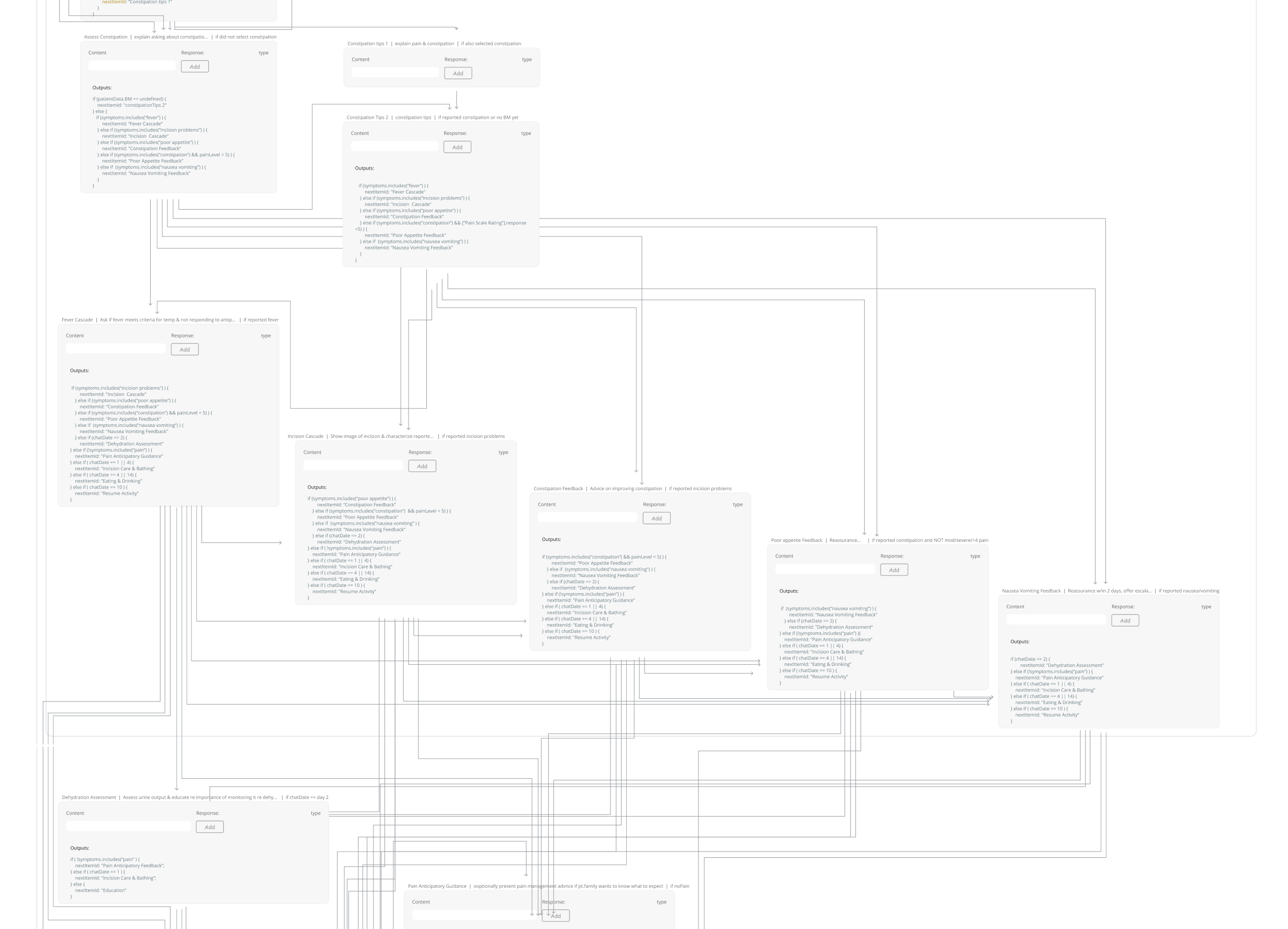 Data model studies were conducted to compare entry logic (conditionals) vs exit directed logic (decision pointing to next step) to determine the best approach for dynamic conversations forward. Ultimately entry logic was chosen .
