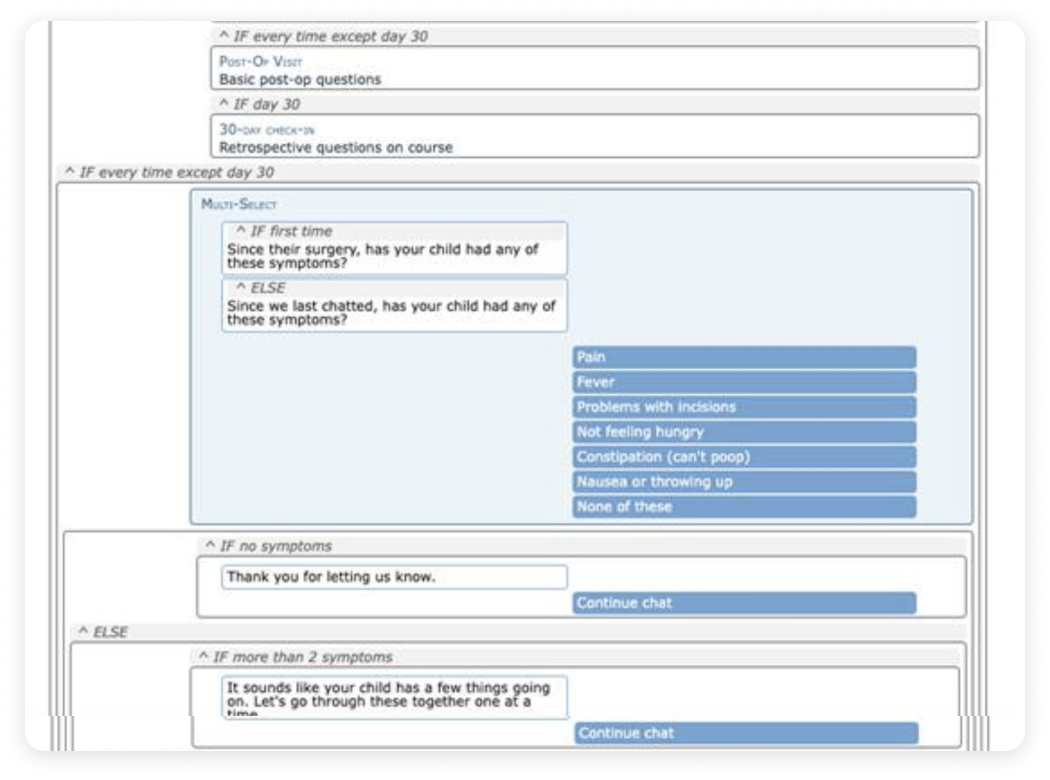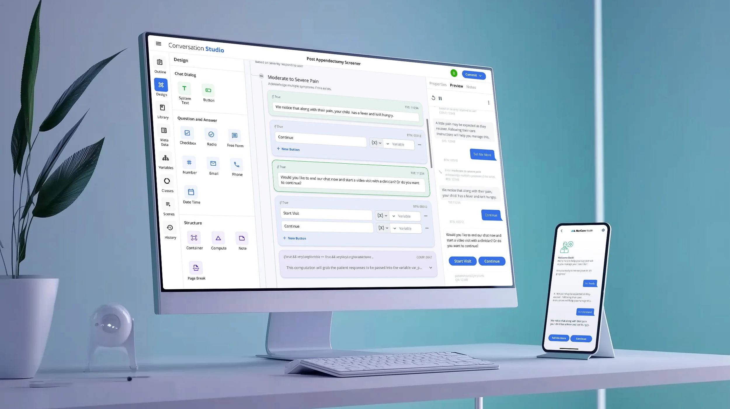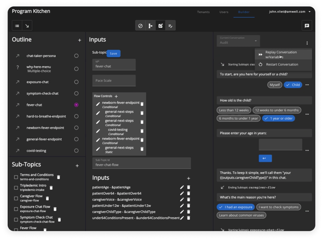 Conversation Builder - Previewing conversations allow for product development to run clinical chats while building in order to validate flows and experiences. Clinical Chats are taken by consumers on their device of choice through an application or online