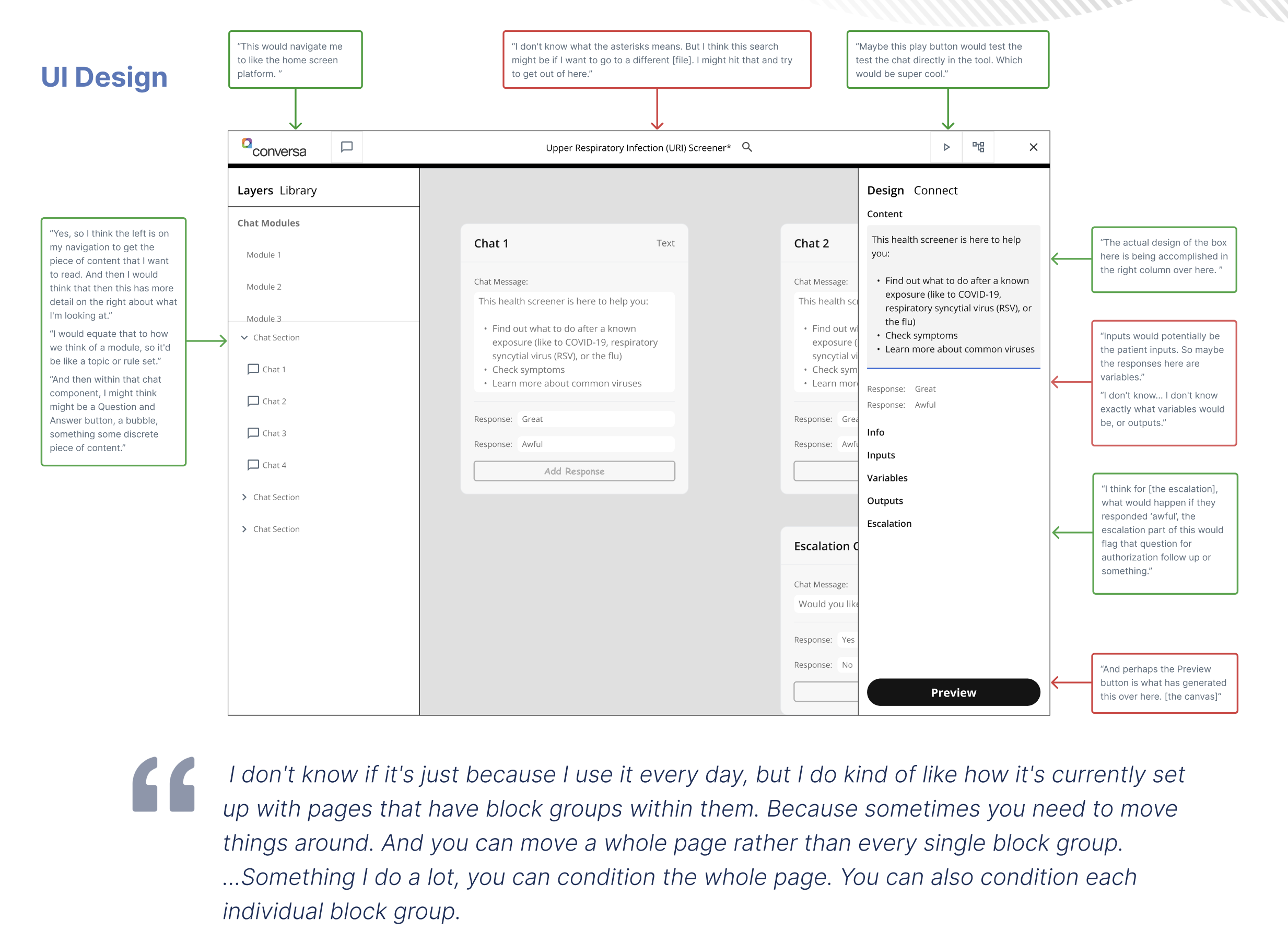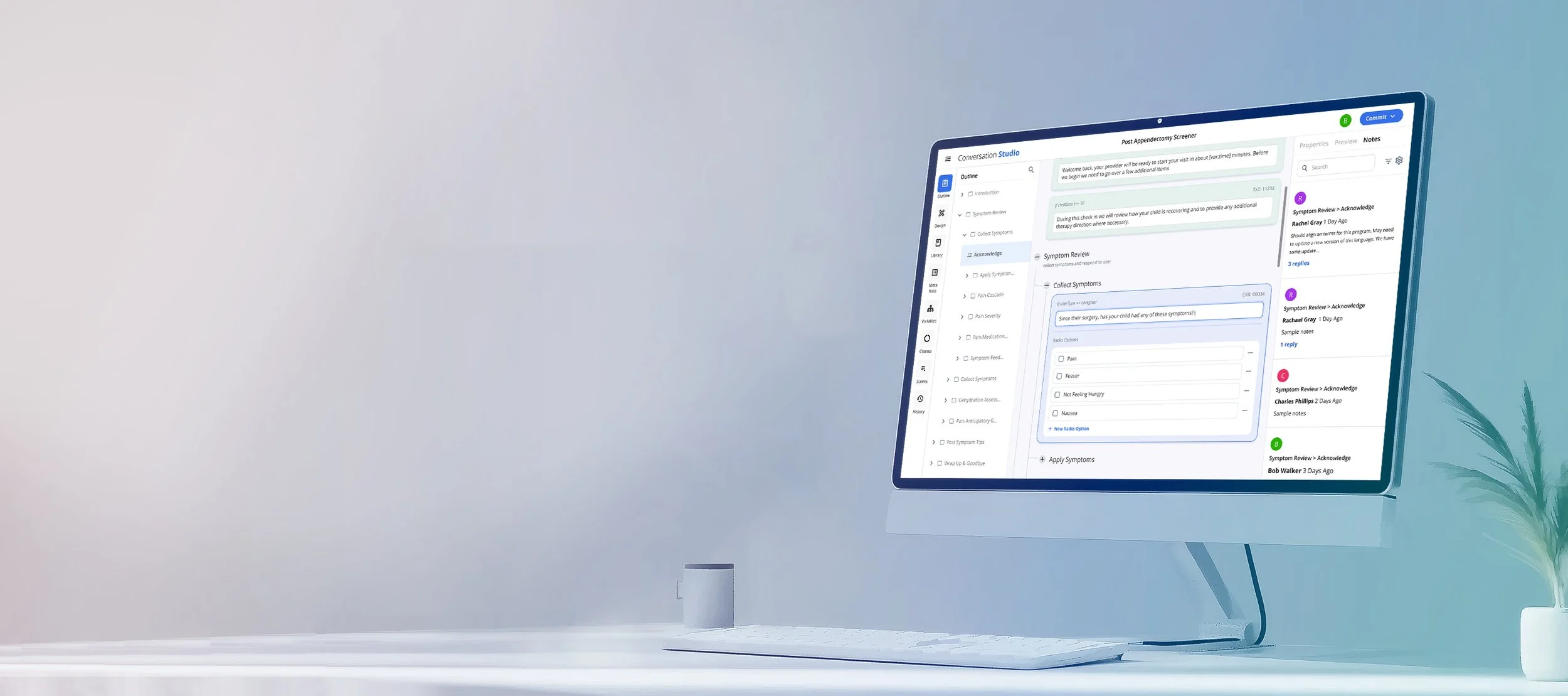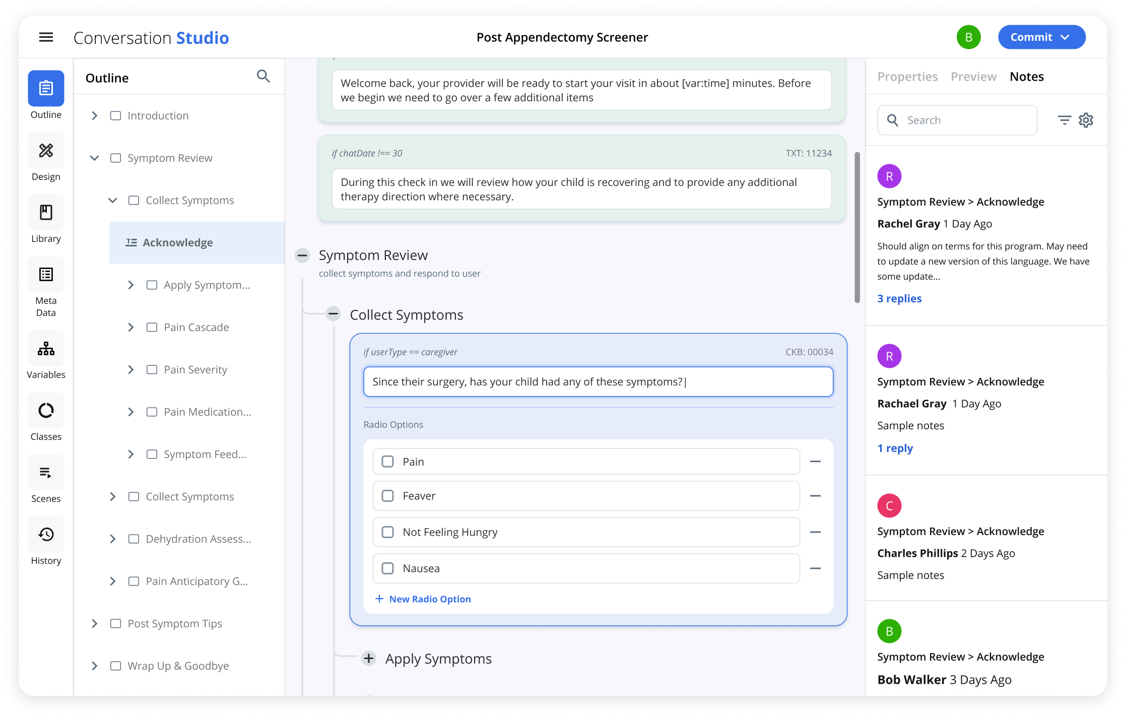 Conversation Builder - Previewing conversations allow for product development to run clinical chats while building in order to validate flows and experiences. Clinical Chats are taken by consumers on their device of choice through an application or online