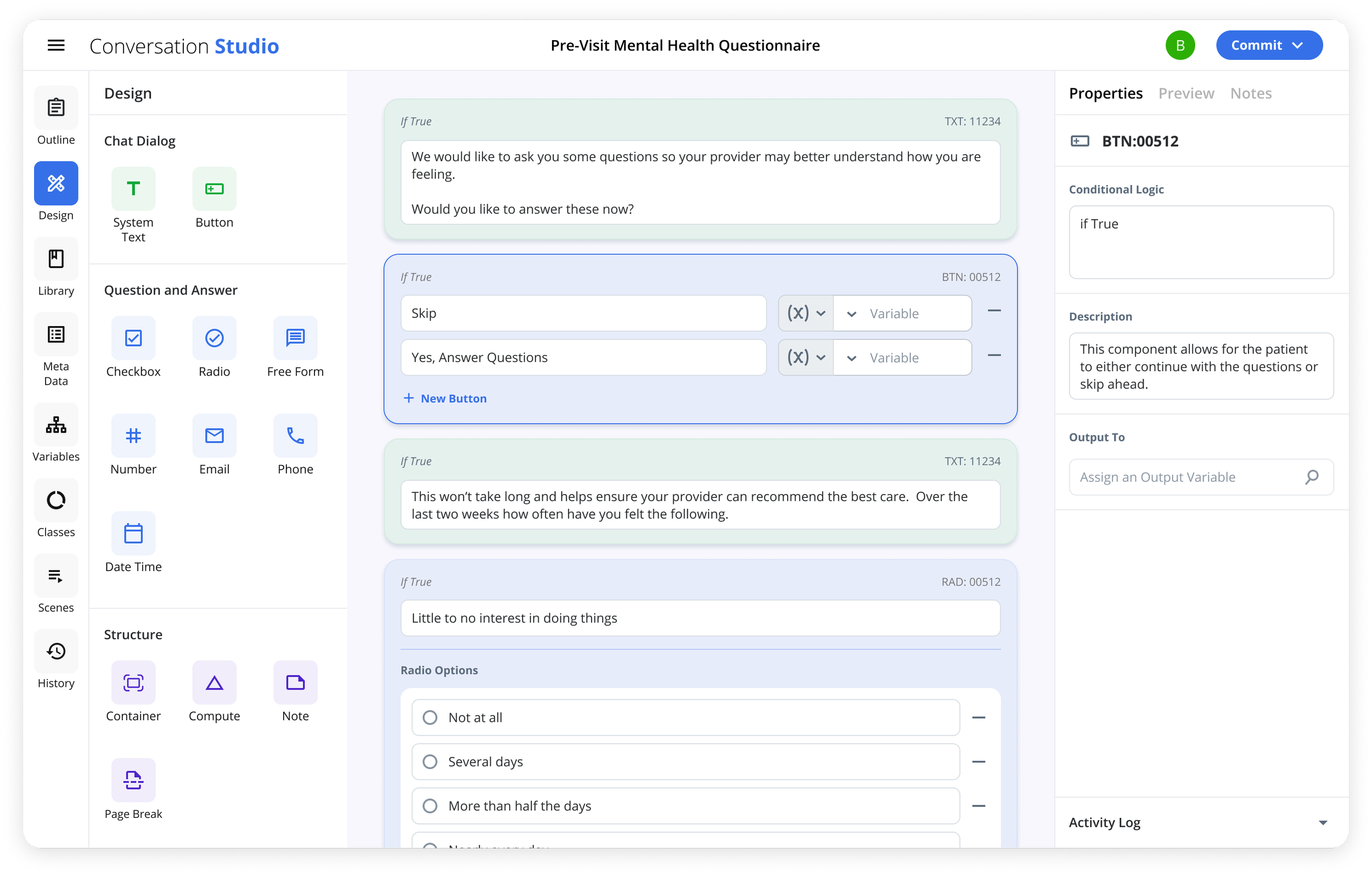 Conversation Builder - Design panel contains all components to build a program. Components are placed, edited, and rearranged in the workspace. Component meta and logic are added in the properties panel.