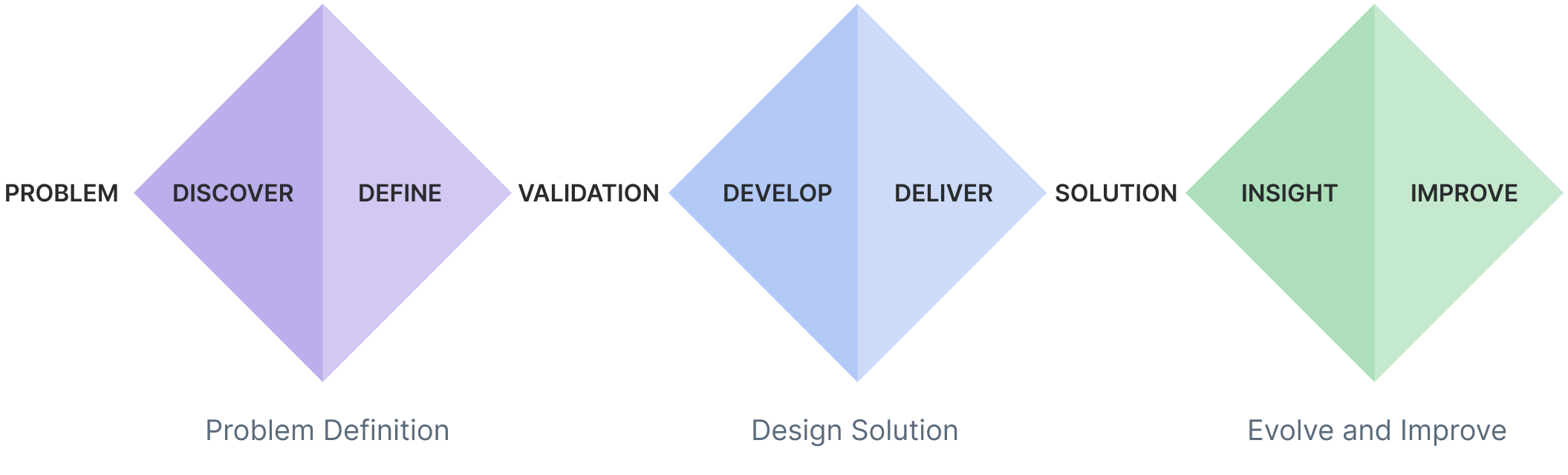 Not another diamond process! Ours followed a slightly different path. Each problem that we tackled followed a process of: 1. Problem Definition, 2. Solutioning, 3. Validate and Iterate, 4. Implementation