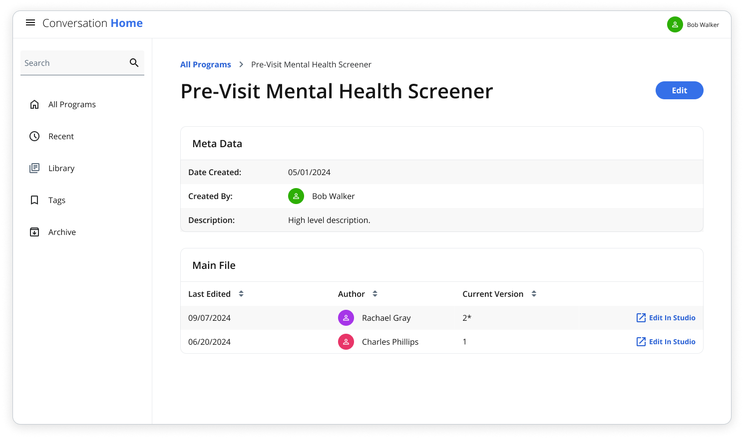 Conversation Home - Program details: Displays basic meta data and authoring information about the program along with version history.