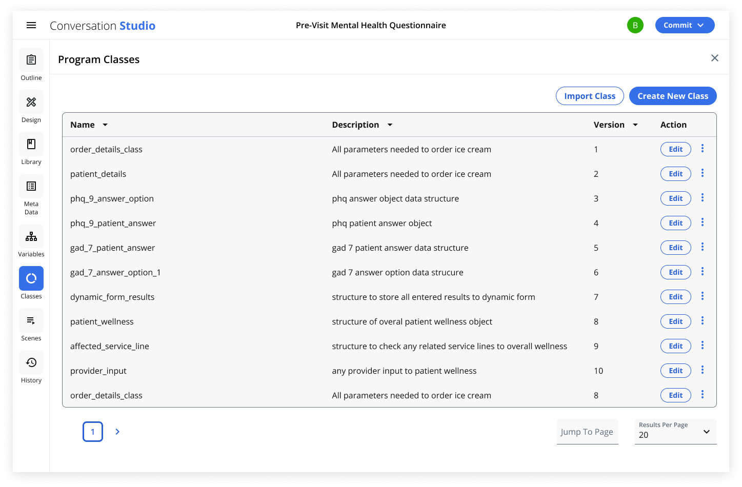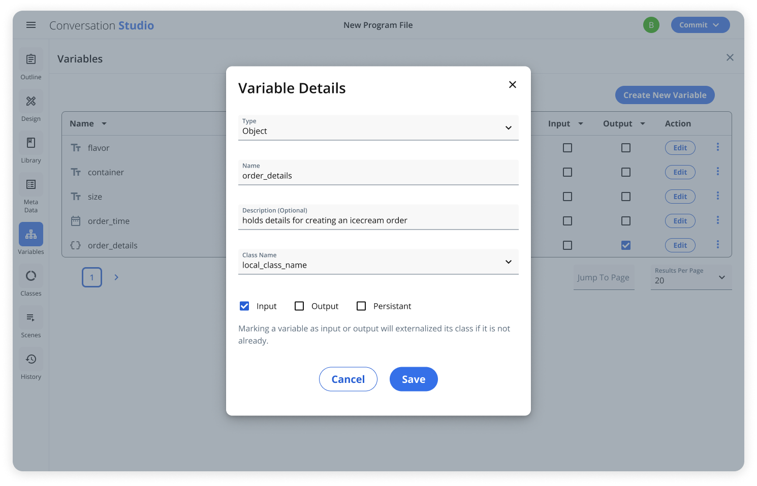 Conversation Builder - Classes panel allows for managing schemas and structures for object variables, allowing for reuse across different programs.