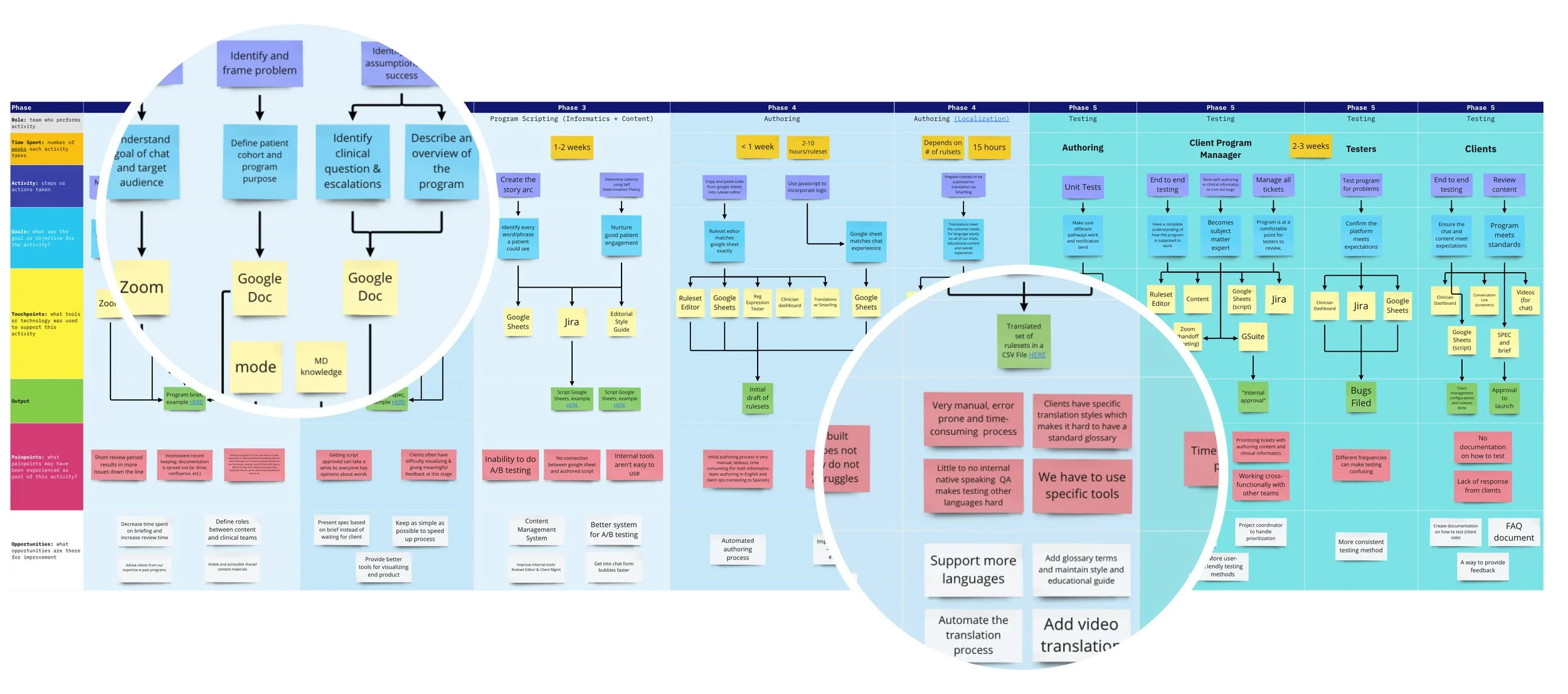 With the program development teams we explored their existing workflows, processes, needs and proof of concepts around building chats. We also ran a series up 1 on 1 interviews with members across the group in an effort to get more open and honest feedback from the individuals. This research helped paint a picture of the current program development processes, pain points and a wish list of improvements.