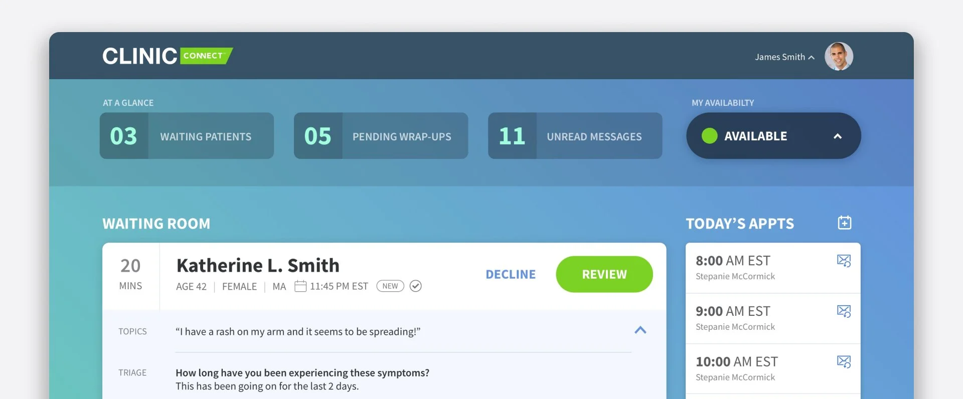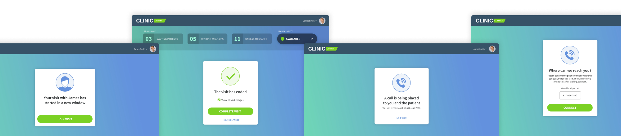 We focused in on the primary workflow for on demand visits, demonstrating how the provider manages patients waiting for care in a queue, reviewing their info and carrying out a visit. This involved 3 key areas which were the Waiting Room, Patient Details and the Visit Console. Visit details and summary could then feed into the provider’s EHR to they could add their notes and wrap up.
